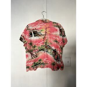 Pink short sleeve womens hawaiian shirt with palm trees and ocean print throughout.