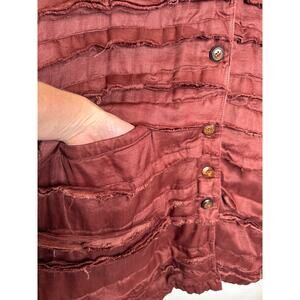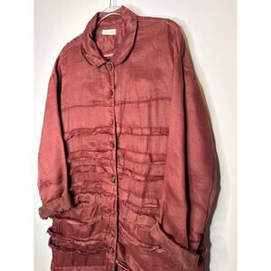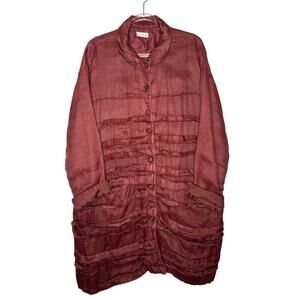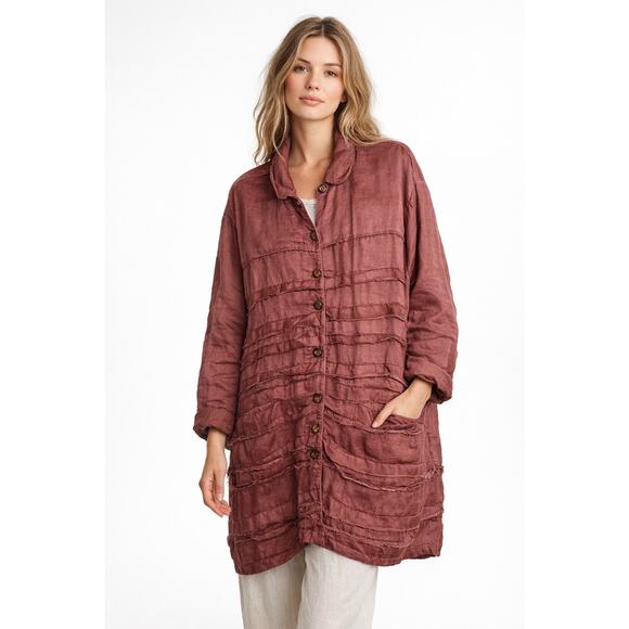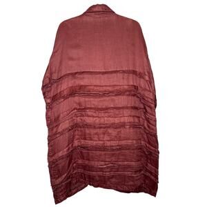 Artisan-made silk overshirt by Krista Larson in a muted mauve rose tone. Features a relaxed, oversized silhouette with button front closure, drop shoulders, and signature horizontal crinkled texture panels throughout the body. Lightweight yet substantial with beautiful natural drape. Designed to be worn open as a layering jacket or buttoned as a tunic-style shirt. A timeless, slow-fashion piece known for Krista Larson’s understated, architectural aesthetic.