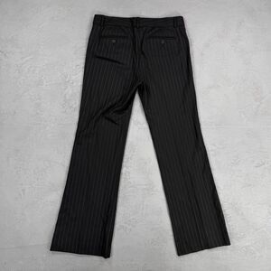 2000s Theory Max C pants. Black wool fabric with a black vertical stripe. Low rise. Flared leg. Zipper fly with top hook closure. Slant front pockets and welt back pockets.