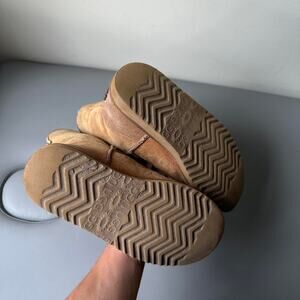 Nice ones. Cool worn “vintage” look. It’s important to wear your Uggs everyday, it’s cold out here. Freshen up. Condition is worn, see photos. Small tear shown as well as bottom scuffs.