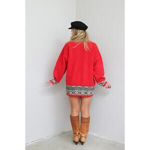 2000's Oversized style Sweater in women's size sm to lg or men's size md. Boxy, baggy fit wide fit. Slight stand up collar with pretty fair isle pattern in white and black that matches the cuffs and hem. Fabric is a pure wool in a warm dense knit that has a nice texture. In excellent vintage condition with no flaws to note.