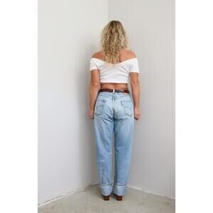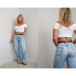The perfectly distressed early 2000's 501 jeans in women's size lg to xl or men's md. Mid rise, button fly and classic straight leg fit. Longer inseam. Lighter wash in a faded in and distressed style. 100% Non Stretch cotton denim. In distressed vintage condition with some paint spots, minor holes and some fraying that give these a great won in style!