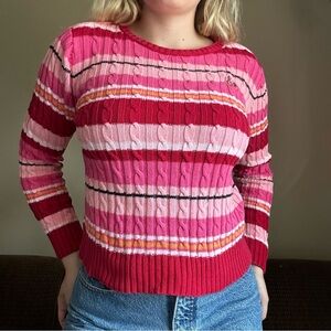 2000s Y2K Liz Claiborne Pink Striped Embroidered Cable Knit Sweater