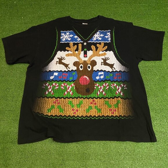 2000s Y2K Rudolph Reindeer Ugly Christmas T-Shirt Black XL M&O Cotton Funny Holi