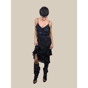Could this be the perfect little black dress? Lashings of silk and tiered ruffles dance along the skirt. Intricate beadwork of roses in metallic black and silver. The scooped back with it's delicate ruffle finishing. It's completely divine.