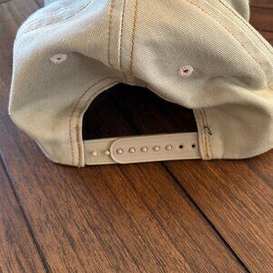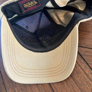 This is a vintage (circa early 2000s) Von Dutch Trucker hat. The mesh is blue, and the fabric portion of the hat is khaki/tan colored. The hat is in great condition and shows little sign of wear and tear.