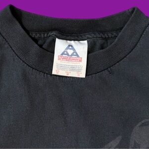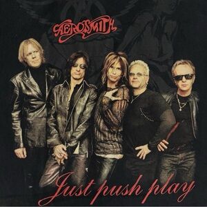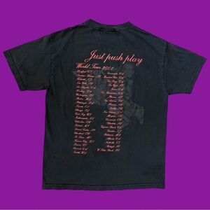 Black Aerosmith tour tee from their 2001 “Just Push Play” run. Full front band graphic and tour stops on back