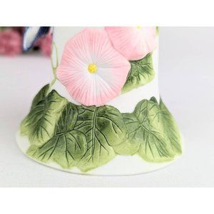 Pristine 2001 Avon Fine Collectible Blue Jay and Flower Bell. The bisque porcelain figurine is a vividly colored blue bird sitting on top of a white bell embossed with pink morning glory flowers and green ivy leaves around the bell rim. The bell is clearly marked on the inside of the bell. The bell is in pristine vintage condition and will be shipped along with its original packaging to add to its authenticity. Estate collection. Gift worthy. Display worthy. Avon collectible.