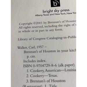 2001 Brennans of Houston in Your Kitchen Signed Carl Walker Vintage Cookbook. Gorgeous pictures with pages full of recipe's from Chef Carl walker. Cookbook is signed with a dedication.