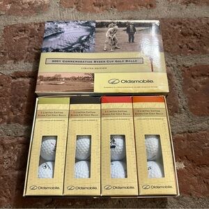 Celebrate the Ryder Cup with these limited edition golf balls from 2001. Commemorative Ryder Cup Golf Balls, sponsored by Oldsmobile. Presented as a Promotional Item by Oldsmobile. This collection is considered rare and valuable among golf collectors due to the 2001 Ryder Cup being cancelled following the events of 9/11, making these commemorative items particularly unique.