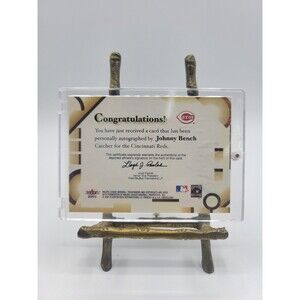 The product is a 2001 Fleer Greats of the Game trading card featuring an autograph from legendary baseball player Johnny Bench of the Cincinnati Reds. The card is a standard size with a 20 Pt. card thickness, made of card stock, and authenticated by Fleer. This vintage card is a hard-signed autograph from Bench himself, making it a highly sought-after collectible for fans of Major League Baseball.