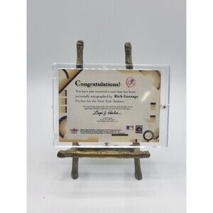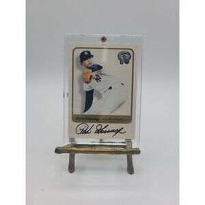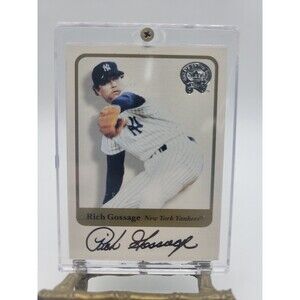 The 2001 Fleer Greats of the Game Rich Gossage autographed trading card features the legendary New York Yankees pitcher's signature on a vintage card from the MLB World Series set. Manufactured by Fleer in 2001, this baseball card is a 20 Pt. card stock insert with a hard-signed autograph authenticated by Fleer. This original sports trading card is a valuable collectible for fans of Rich Gossage and the New York Yankees, showcasing the player's autograph in English on a standard-sized card.