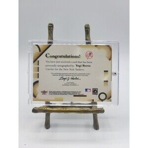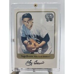 The product is a 2001 Fleer Greats of the Game trading card featuring an autograph from Yogi Berra of the New York Yankees. This vintage card is a hard-signed autograph on standard-sized card stock, with a thickness of 20 Pt. It is an original insert card from the set "2001 Fleer Greats of the Game" and is authenticated by Fleer. The card is from the MLB World Series event/tournament and is a must-have for baseball fans and collectors of sports trading cards.