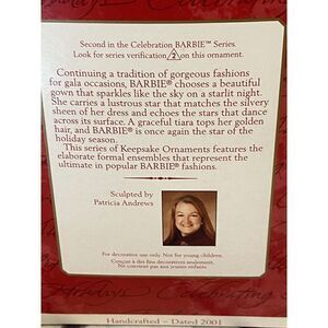 This 2001 Hallmark Keepsake Celebration Barbie Silver & Stars Ornament Series #2 NIB is a must-have for any Barbie fan or collector. The beautiful star-shaped ornament features Barbie adorned in a stunning silver dress and surrounded by stars. It's perfect for decorating your Christmas tree or adding to your collection of ornaments.