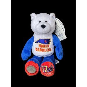 Celebrate the Tar Heel State with this 2001 Limited Treasures North Carolina State Quarter Coin Bean Bear Plush. Featuring the iconic North Carolina state quarter, this charming bear is a must-have for collectors or anyone with a love for North Carolina's history and culture.