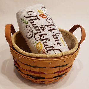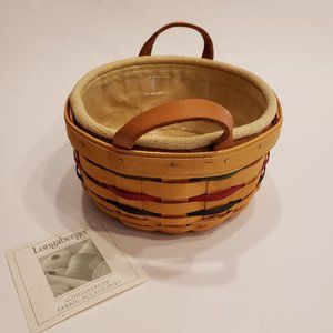 2001 Longaberger Button Basket with Protector and Liner. Top is 6.5" diameter, height is 3.5", leather handle tops at about 4.75". Olive, dark blue (near black), and red narrow weave accent. Sold with protective plastic liner and golden fabric cloth liner.