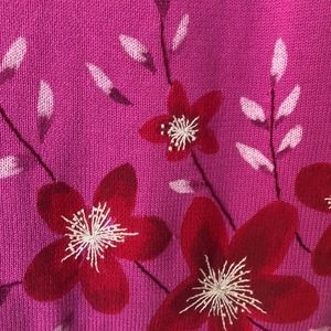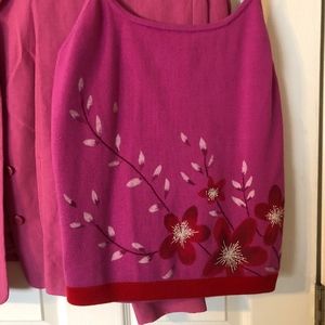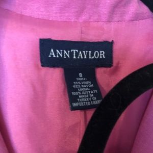This is a pink Ann Taylor pants suit. It includes a six 10P pants with zipper on the side, a pink blazer with hidden buttons and Asian style embroidered pink shell/tank top knit. The blazer jacket and pants are linen and rayon. The jacket is size 8 and the knit top is size Medium.