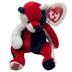 This adorable TY plush bear features vibrant red and blue colors, perfect for kids to cuddle and play with. Its soft texture and charming design make it a delightful addition to any toy collection. Ty Beanie Baby named "Patriot". It is a bear with red, white, and blue coloring, representing the colors of the American flag. The bear has a black nose and black eyes and a ribbon tied around its neck. It also has a Ty tag attached to its ear. According to search results, this Beanie Baby was released as a USA Exclusive and is part of the Teddy Bear style TY Beanies. It was introduced on May 1, 2001, and retired on June 20, 2001. The bear's birthday, as indicated on some tags, is May 29, 2000. Some versions of the bear have the American flag on the right foot, while others have it on the left. "Patriot" was created to celebrate American patriotism. It is considered a collectible item, with some versions, particularly those with tag errors or rare variations, being more valuable.