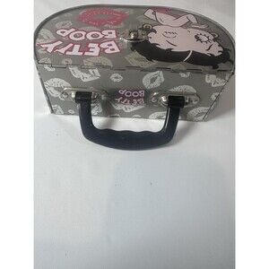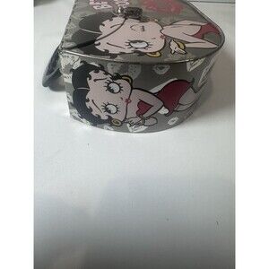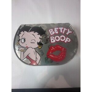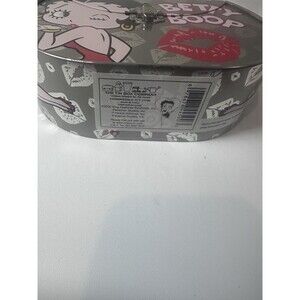 The product is a 2002 Betty Boop blowing a kiss tin metal silver purse lunch pail by The Tin Box Company. It features a cartoon character theme with a multicolor design. Made of tin, this collectible item is part of the Betty Boop franchise and is a piece of animation merchandise.