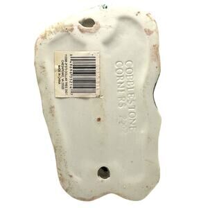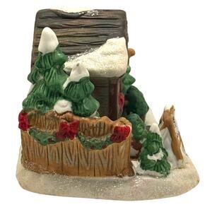 This ceramic Cobblestone Corners depicts a snow-covered “Trees for Sale” stand beside pine trees and a log cabin façade. Measures approximately 5″ W, 2.75″ H × 3.25″ D, and dates to 2002. The piece is in very good used condition, no visible damage. The underside is stamped “Cobblestone Corners 2002” and has its original sticker intact.