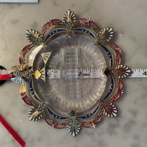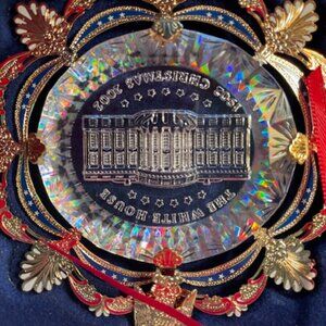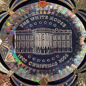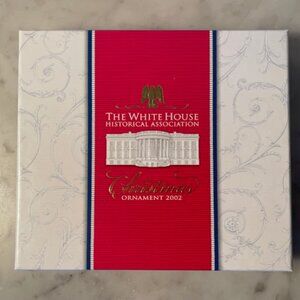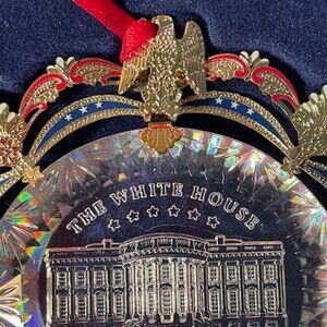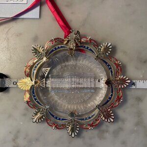 The crystal-like acrylic core of the 2002 Official White House Christmas Ornament recalls the sparkling Bohemian glass of the elegant East Room chandeliers. The brass metal decorative frame includes a holiday ribbon, acanthus leaves from the East Room's Louis XVI style wall panels, and a sturdy eagle, inspired by the carved mahogany pedestals of the console tables.