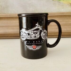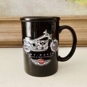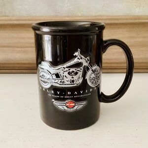 This cool black mug celebrates the 100th Anniversary of Harley-Davidson. Mug is embossed on the one side with the motorcycle and log, also says "100 Years of Great Motorcycles" between the cycle and logo. Mug is about 5" tall.