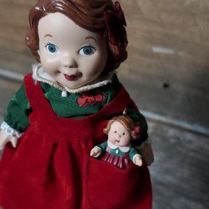 This doll ornament is designed by Nina Aube. Comes with a gift card. The Dolly in Mistletoe Miss' pocket can also be hung seprately.