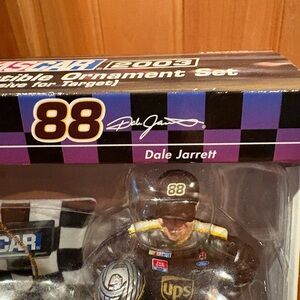 This set includes two ornaments: a replica of Dale Jarrett's iconic #88 UPS Ford race car and a figure of Dale Jarrett in his racing suit. It's a vintage NASCAR collectible, specifically from the 2003 season, making it a sought-after item for racing fans and collectors. The set is officially licensed and was originally sold as a Christmas ornament set. In original packaging good condition. Thanks for looking!
