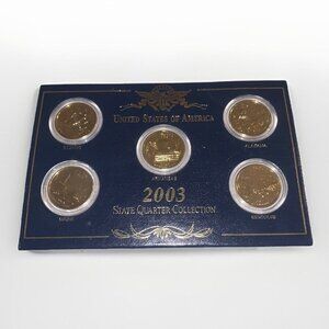 This is a rare and valuable set of 5 State Quarter coins plated with 24 KT gold. The coins were minted in Denver, United States in 2003 and have not been circulated. The denomination of the coins is 25C and they are made of gold. The set is a proof set and is uncertified.