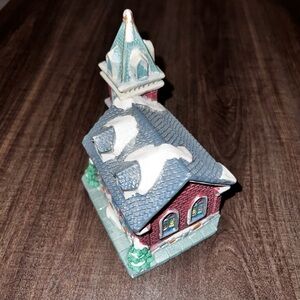 The 2004 Cobblestone Corners Windham Heights Christmas Village Church is a small, asymmetrical porcelain building from the Windham Heights collection. It features a colorful design suitable for the Christmas season, depicting a village scene. The church is part of a Christmas village set, with a height of 5 inches and a length of 4¾ inches, making it a charming addition to holiday decor. The item is not signed and comes unboxed.