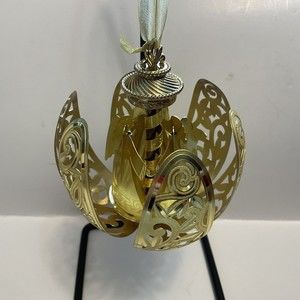When the bottom finial of the ornament is turned counterclockwise, the filigreed panels slowly open in a flowerlike effect that reveals three angels holding hands in prayer. On a banner are their wishes for the world: Hope, Joy, Peace, and Love.