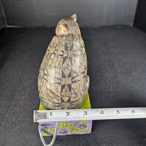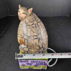 A 2004 Jim Shore Heartwood Creek titled Don't Cross My Path, item number 117679. This Halloween cat figurine is made of hand painted resin with a patchwork design that is characteristic of Jim Shore's folk art style. The cat figurine is a chunky cat that grayish tan and has a black folk star pattern. He is in an upright sitting position and his face has a glaring stare. He has short black whiskers and a long skinny tail. He's sitting on a square purple and green base with the phrase Don't cross my path. This figurine is in great use condition. The only flaw I found inspecting it is a small white line on the backside of his head. See my pictures, one that has my finger pointing it out. No box. Stand approximately 7 inches tall, 3 inches wide. Non-smoking pet free home. @ BR #4