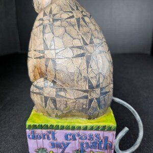 A 2004 Jim Shore Heartwood Creek titled Don't Cross My Path, item number 117679. This Halloween cat figurine is made of hand painted resin with a patchwork design that is characteristic of Jim Shore's folk art style. The cat figurine is a chunky cat that grayish tan and has a black folk star pattern. He is in an upright sitting position and his face has a glaring stare. He has short black whiskers and a long skinny tail. He's sitting on a square purple and green base with the phrase Don't cross my path. This figurine is in great use condition. The only flaw I found inspecting it is a small white line on the backside of his head. See my pictures, one that has my finger pointing it out. No box. Stand approximately 7 inches tall, 3 inches wide. Non-smoking pet free home.