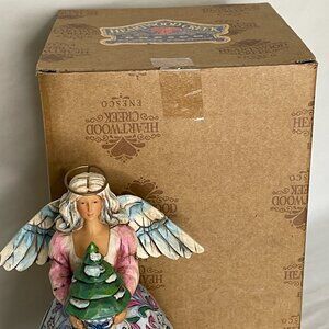 This 2004 Jim Shore "Landscape Sleeps" Winter Angel is just lovely. Made by Heartwood Creek (Enesco Group). She is holding a Christmas tree. Her dress has a Scandanavian look with holly trim and a green bow at the back. She is in excellent condition--no damage. Comes in original box.