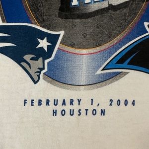 20 year old Vintage Men’s Large NFL T-Shirt from Super Bowl XXXVIII in Houston, Texas from February 1, 2004 when The New England Patriots defeated The Carolina Panthers! Never worn! Great shirt! Still has original sticker attached, NWOT!!!