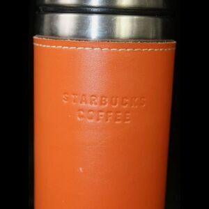 2004 Starbucks Stainless Steel 12oz Thermos Orange Sophisticate Leather Wrap.