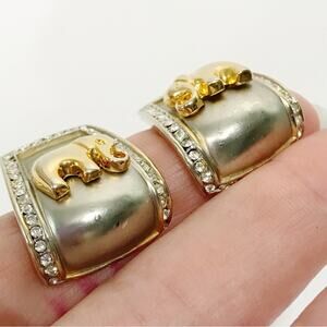 2005 AD Signed Mixed Metal Mate Silver and Gold Tone Clear Rhinestone Lucky Elephant Pierced Stud Half Hoop Huggie Earrings