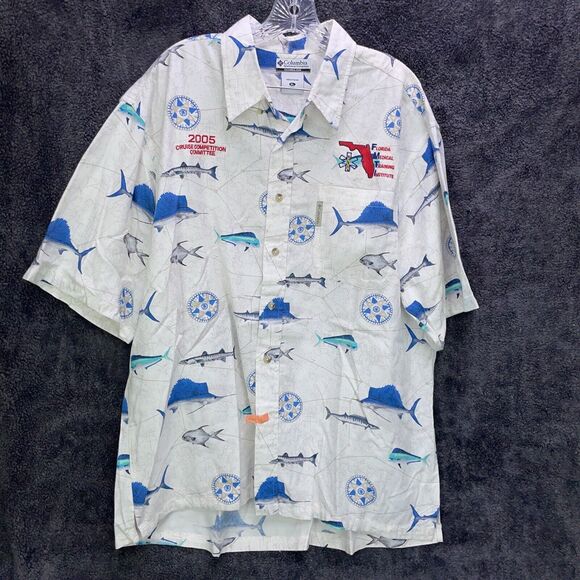 Brand: Columbia Style: Button Front Shirt Color: White US Size: XL Pattern: Fish Closure: Buttons Features: Cotton Blend