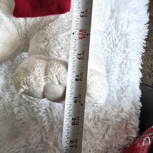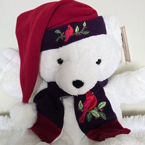 2005 Dan Dee Collectible Plush Bear measures at 19 inches tall. This white bear is dressed for the holiday season, featuring a red Santa hat and a purple scarf embroidered with elegant red cardinals and green leaves. On its left foot, the year "2005" is embroidered alongside two red cardinals. Perfect for collectors or as a delightful addition to holiday decor. Originally purchased from Kmart & original tags are still attached for authenticity.