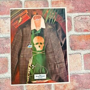 Original 2005 Marc Ecko Vintage Print Ad featuring a bold flat lay of a green skull-and-crossbones sweater paired with a plaid blazer. A rebellious, streetwear-infused snapshot of early 2000s fashion—equal parts edgy and nostalgic.
