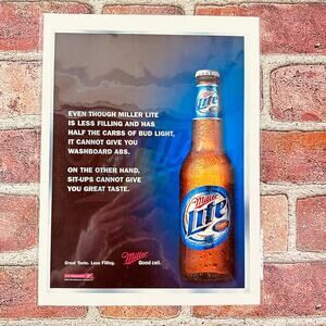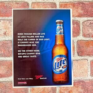 Original 2005 Miller Lite Beer Vintage Print Ad featuring a cheeky tagline: “Even though Miller Lite is less filling and has half the carbs of Bud Light, it cannot give you washboard abs. On the other hand, sit-ups cannot give you great taste.” A witty, self-aware slice of Y2K beverage advertising that blends humor with bold branding.