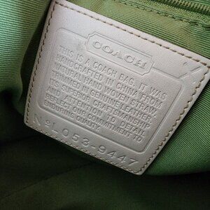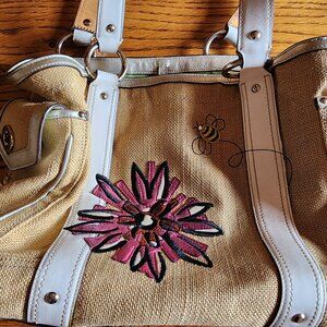 This vintage Coach handbag is a limited edition piece featuring a unique bee and flower motif. Made of leather with a floral pattern, this medium-sized tote bag has 2 pockets inside and 1 zipper pocket and leather straps. The exterior color scheme includes shades of straw floral and with silver trim and an olive green lining. The bag also comes with a charm accessory, making it a stylish and functional choice for women who appreciate vintage fashion with a modern twist.