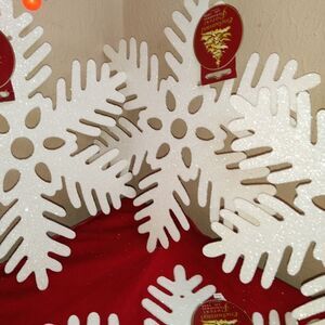 6 medium to large size White glitter snowflakes 5 new with tags 1 like new without tag and just like any item with glitter some does come from objects, about 11" tall