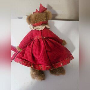Adorable teddy bear in a red dress with a matching bow. Perfect for collectors or as a gift.