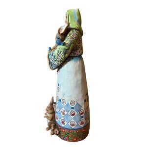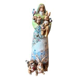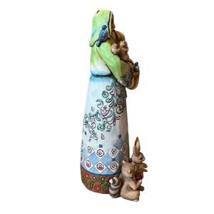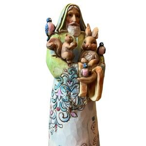 Embrace serenity and tranquility with this exquisite Jim Shore Heartwood Creek figurine. Crafted from high-quality resin, this figurine features intricate carvings and painted finish in a multicolor scheme. The piece depicts a heartfelt message of Lord Make Me an Instrument of Your Peace with a charming rabbit, raccoon, birds, and squirrel cast as the central characters. Standing at 10.5 inches of height and 4.5 inches of width, this American-style figurine is perfect for any room and occasion, adding a touch of religious theme to your decorative collectibles. It is in very nice condition with no flaws to note.