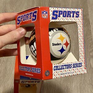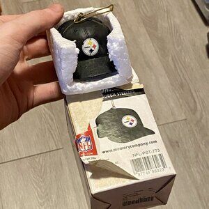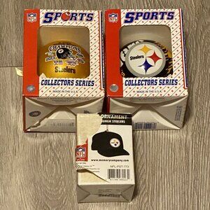 Set of 3 Christmas Ornaments. 2 Glass Balls and 1 Steelers Fitted Hat. The 2 orb ornaments are brand new, unopened in the original packaging. The Steelers Hat ornament is made of hard ceramic and is open box / used and has some wear to it (see photos).