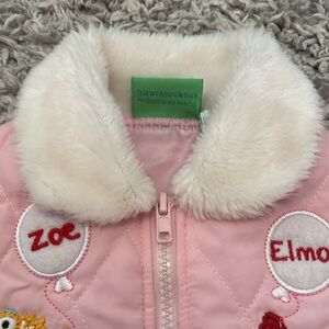 Adorable pink vest featuring embroidered Elmo and Zoe holding hearts and ballon’s with their names in them. This would be perfect for Valentine’s Day! In good used condition, I didn’t notice any flaws.