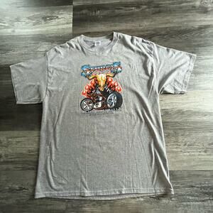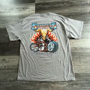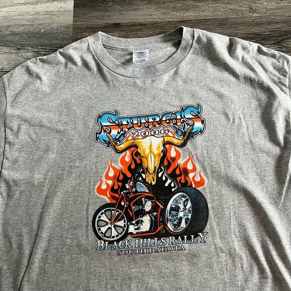 2006 Sturgis Black Hills Rally South Dakota Heather Grey Biker Graphic Tee skull flames double sided graphic t-shirt spellout center chest back hit motorcycle