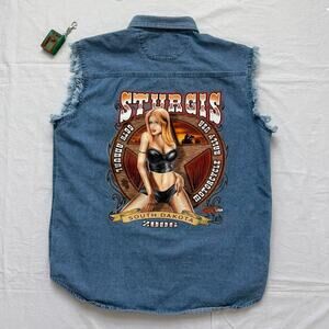 Denim vest with large back graphic in excellent condition, no flaws spotted beyond a loose thread. Embroidered Sturgis graphic on chest.