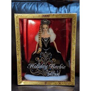 2006 Holiday™ Barbie® by Bob Mackie - New in Box. This most beautiful season brings celebrations filled with the joy and love of family and friends. If you believe, the holidays deliver the gifts of harmony and hope, wrapped in magic and decorated with glamour! Bob Mackie again presents a beautiful gift for this special season. The 2006 Holiday™ Barbie® by Bob Mackie is wonderfully sophisticated in a black gown and white faux fur, embellished with festive multicolored stars. 2006 Holiday™ Barbie® marks Mr. Mackie's second Holiday™ Barbie® doll creation, sure to be treasured for years to come.